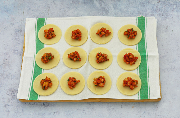 6Mouillez le pourtour avec votre doigt, puis fermez les disques de pâte en demi-lune. Ecrasez les extrémités avec vos doigts, afin de souder le bord de la pâte autour de la farce.