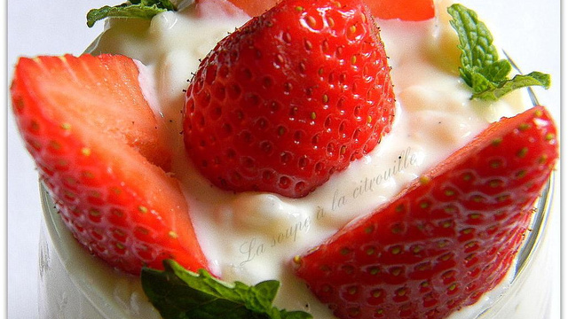 La saison des fraises démarre, enfin on en trouve sur les marché. Bien sûr rien ne vaut la cueillette des fraises au jardin, malheureusement cette année ici nous avons un mois de retard, à peine des feuilles pour l'instant... Au jardin, les fraises ne sont pas qualibrées et certaines sont peu présentables, du moins pour en faire des tartes ou de jolies présentations. La solution est bien sûr dans la confection de confiture (voir ici) ou bien j'en fais une petite compote qui se marie à merveille avec un riz au lait à la vanille bien crémeux.