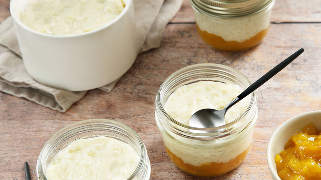 Verser de la compotée de mangue au fond d’un pot en verre, puis remplir avec du riz lait. Conserver au réfrigérateur.