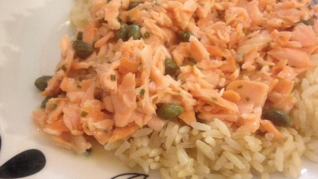 Couper le saumon en dés, le faire cuire avec le jus de citron. Ajouter la ciboulette, les câpres; la crème et prolonger la cuisson.