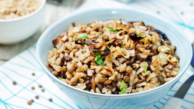Ajoutez les lentilles, le sel et poivre, et l'eau. Faites bouillir, puis ajoutez le riz dans la casserole. - 2
