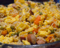 Faire revenir l'ail et l'oignon hachés dans de l'huile chaude, y rajouter le riz.