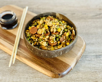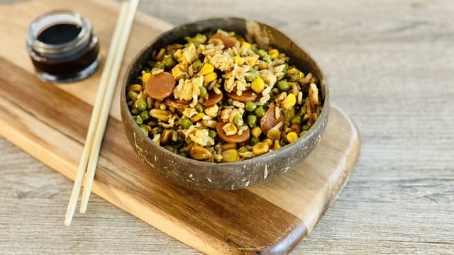 Le riz cantonais est un plat que je ne fais pas souvent, car je ne suis pas une grande mangeuse de riz. Et puis il y a du soya dans la recette "classique" - si tu me connais personnellement tu sais que je ne peux pas manger du soya (je fais donc deux préparations différentes). Mais c'est une recette qui est tout de même assez rapide à réaliser et qui a l'avantage d'être complète au niveau des apports nutritifs.
