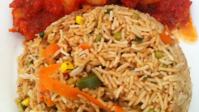 Faire cuire le riz, entre temps sauter l'ail dans un peu d'huile, puis rajouter les carottes coupées en lamelles et les poivrons.