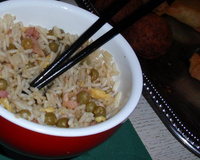 Ajoutez les allumettes de jambon, les petits pois, la sauce soja, mélangez bien.