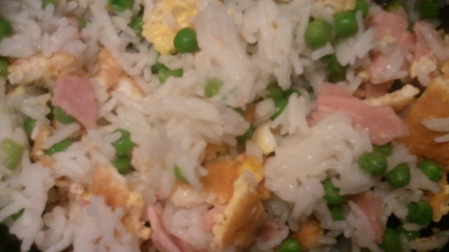 Riz parsemé de petits-pois, jambon, omelette et champignons noirs