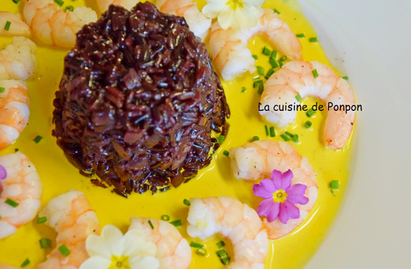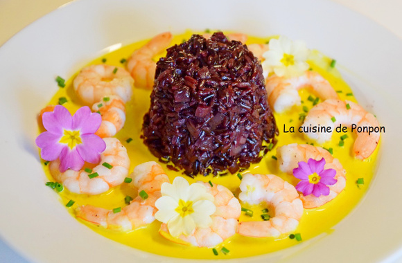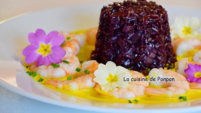 Un plat qui enchante par ses couleurs ! Avec un riz noir qui est une merveille puisqu'il était réservé à l'empereur de Chine, entouré d'une collection de crevettes décorées de fleurs colorées.