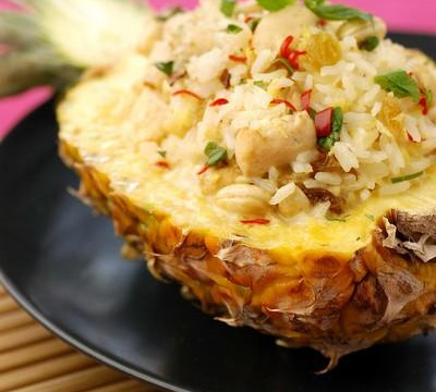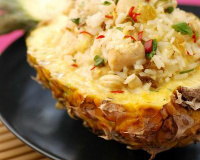 Rajoutez le nuoc-mâm, le lait de coco, la chair mixée d'ananas, le piment et le sucre et portez à ébullition. Rajoutez alors la coriandre, les noix et les raisins et le riz. Remplissez l'ananas de riz et chauffez à four chaud.
