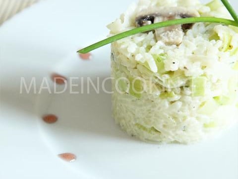 Chauffer la poêle à feu vif. Faire cuire le riz avec de l'eau et le bouillon de légumes pendant 10 minutes. Pendant ce temps-là rincer les poireaux et les champignons, couper en rondelles les poireaux. Couper grossièrement les champignons. Hacher l'oignon, persil et ciboulette.