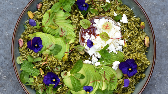 Une recette proposée par l’Organisation Mondiale de l’Avocat : Un plat parfumé et verdoyant aux herbes vertes, aux épinards, à l’avocat, à la féta et à la sauce pimentée.