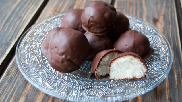 Faites fondre le chocolat noir en bain-marie puis plongez les rochers de coco un par un dans le chocolat fondu.