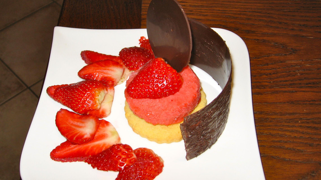 Un sorbet fraise sur un palet sablé, des fraises 'nature' et de fines plaques de chocolat.