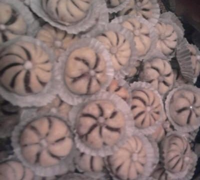 Après, étaler la pâte au rouleau et découper des ronds. Placer une boule au centre, puis rabattre deux extrémités opposées vers le centre. Avec un couteau faire des coupure en trait du centre vers l'extrémité. Piquer le centre avec une boule de bonbons couleur argent. Laisser sécher. Mettre dans un four préchauffé à 150°C pendant 18 minutes.