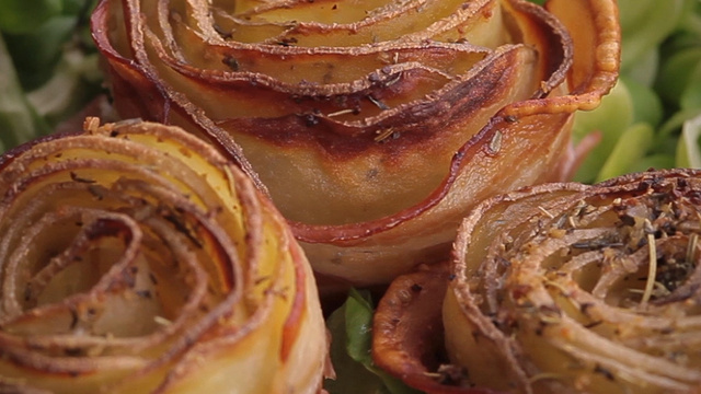 Commencer à rouler les tranches de pommes de terre et les enrouler dans une tranche de poitrine autour de la rose. Recommencer pour chaque.