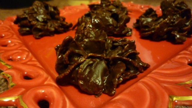 A l'aide d'une cuillère à soupe, prendre un peu de corn flakes et les mettre sur une plaque recouvert de papier aluminium tout en essayant de faire une forme de rose des sable.