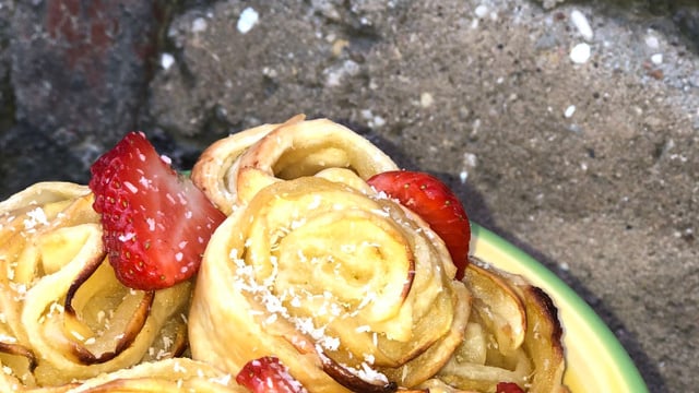 Déposez les pommes sur la moitié supérieure de la bande en les faisant dépasser de la pâte. Repliez la partie inférieure de la pâte sur les pommes. Roulez délicatement la bande sur elle-même en serrant bien. Déposez dans le moule à muffin et beurrez-les. Enfournez pour 20 minutes. Avant de servir, saupoudrez de sucre glace.
