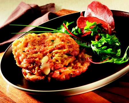 Chauffer deux poêles anti-adhésives avec un filet d'huile d'olive, former deux galettes de 10 cm de diamètre et d'1 cm d'épaisseur dans chaque poêle. Cuire à feu moyen, 3 à 5 min de chaque côté. Déguster avec de la charcuterie et de la salade.