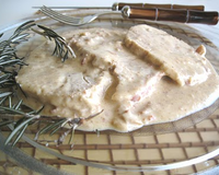 Couper la viande en tranches très subtiles et servir couverte avec la sauce à la crème.