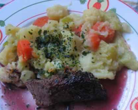 Rôti de boeuf au vin rouge accompagné de pommes de terre, courgettes, carottes.