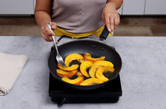10Coupez le potimarron en tranches fines et faites-les rôtir à la poêle avec le gras du Magret.