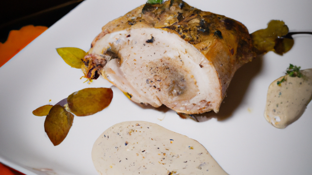 Servir des tranches de rôti de porc tartinées de boursin 3 poivres, croquettes et salade iceberg