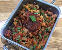 Badigeonner le rôti de porc avec cette pâte, le déposer dans un plat allant au four en le recouvrant d’une feuille de papier cuisson.