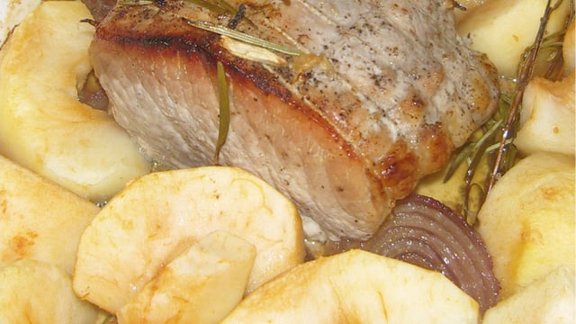 Un rôti version sucrée-salée accompagné de pommes en quartier, une bonne façon de manger des fruits.