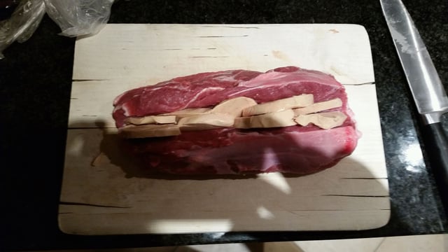 Inciser le rôti dans la longueur et le farcir de tranches de foie gras de 1cm environ.