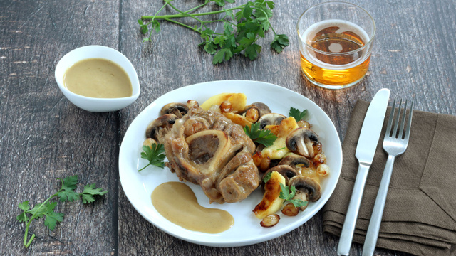 Flambez au calvados puis mouillez avec le cidre et l’eau chaude.