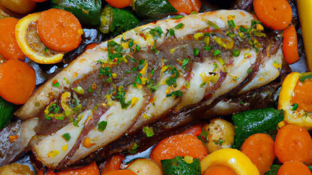 fine brunoise de courgette, fenouil, tomate, poivron jaune, rouge, juste sautée à l'huile d'olive, puis ajouter, les zestes d'orange et de citron,le jus des fruits et le Basilic.