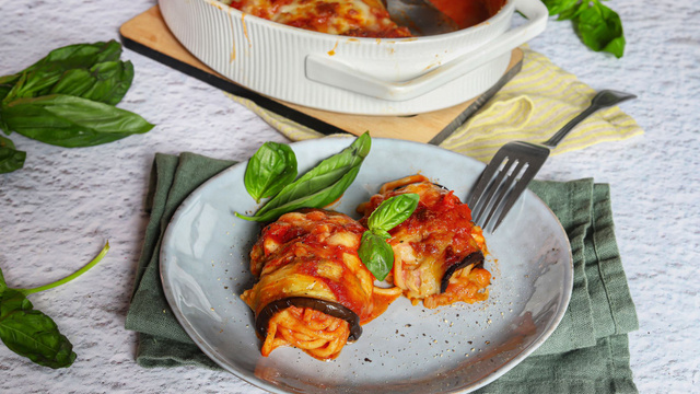 Des roulades d’aubergines farcies qui cachent un cœur de spaghettis : on adore cette recette sicilienne ! Dans la version traditionnelle on fait frire les tranches d’aubergines dans un bain d’huile.