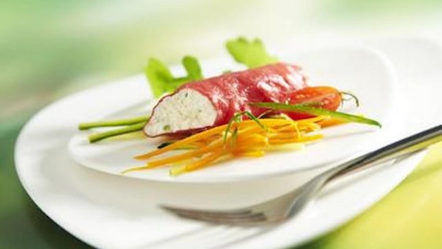 Couper chaque extrémité du roulé de carpaccio de boeuf au fromage frais pour avoir de belles entames franches (soit une coupe droite ou légèrement biseautée).