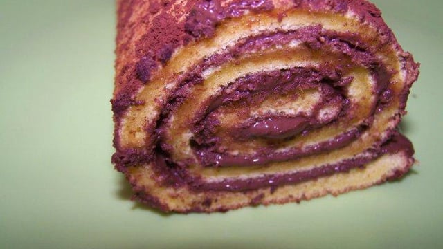 - 5Tartiner de Nutella à la sortie du four. Rouler la génoise et saupoudrer de cacao en poudre !