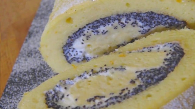 A la sortie du four, laisser tiédir le biscuit. Retourner le biscuit sur un papier cuisson et talquer de maïzena puis retourner. Parer les extrémités et badigeonner de crème de pavot en laissant une marge de 1 cm des extrémités. Étaler une fiche couche de crème chantilly sur la crème au pavot et terminer par la crème pâtissière foisonnée, en réalisant des 4 boudins. Rouler le biscuit en s'aidant du papier cuisson et tasser tout en roulant jusqu'au bout.