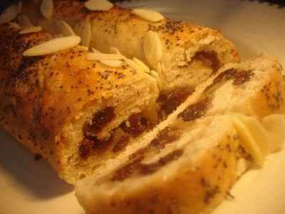 Recette de pâte sucrée et levée, remplie de fruits secs, roulée en spirale et recouverte de graines de pavot.