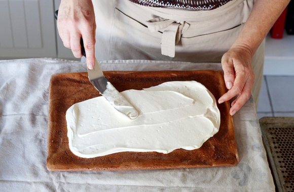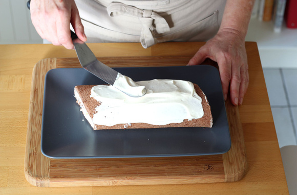 16Posez le biscuit sur le plat de service, ajoutez le reste de la crème et lissez.