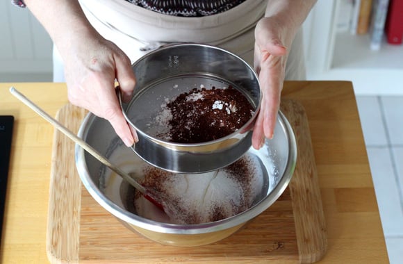 6Tamisez farine, maïzena et cacao au dessus du bol. Incorporez délicatement à la maryse.