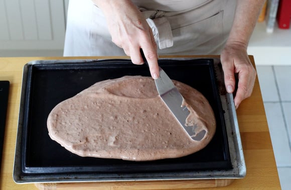 Versez la pâte sur une plaque de 35*25 cm puis lissez avec une spatule coudée. Enfournez dans un four préchauffé à 170°C pendant 8 minutes. Le biscuit doit être souple.