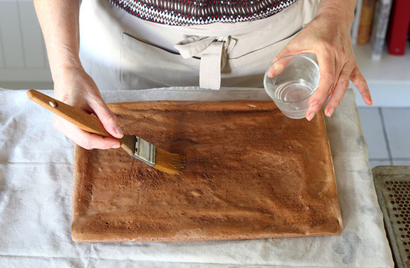 Démoulez le biscuit sur un torchon humide puis imbibez-le au pinceau avec le sirop chaud. Attendez quelques minutes (le biscuit refroidi très vite) avant de le garnir.