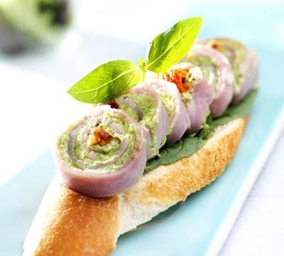 Eplucher l'ail. Mélanger le chèvre, le pesto et vérifier l'assaisonnement. Etaler la préparation sur les tranches de jambon. Rouler les tranches de jambon dans un film étirable pour former un petit boudin. Réserver au congélateur 1 h avant de le découper. Toaster les tranches de pain puis les gratter légèrement d'ail. Découper des médaillons dans les boudins de jambon. Disposer une feuille de basilic sur le toast. Poser les médaillons et agrémenter de pignons de pin.