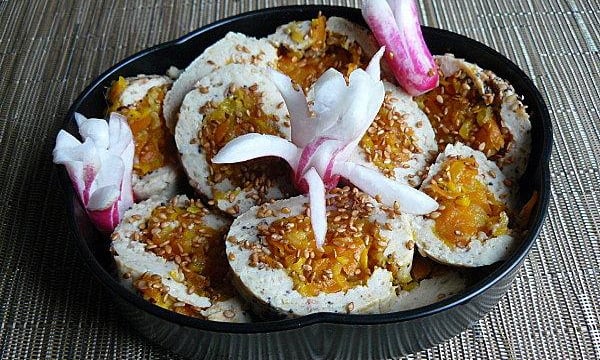 Étaler les légumes sur toute la surface. en laissant une marge d' 1,5cm en haut et en bas rouler le tout délicatement pour former un boudin bien serré (comme un maki), en tortillant les extrémités.