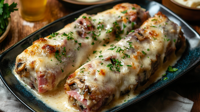 Déposer un peu de préparation de champignons sur une tranche de jambon et rouler la tranche.