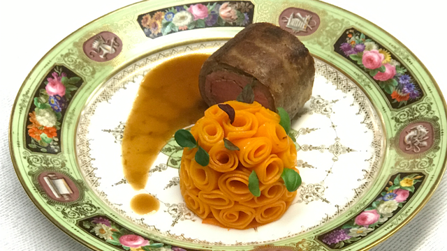 Éplucher et tailler à la mandoline en tranche fine le butternut.