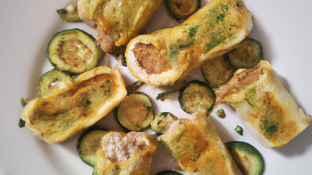 Découper 2 courgettes en tranches de2mm dans la longueur les faire dorer à la poele ou griller disposer sur les escalopes mettre une tanche de fromage genre fondu pour croque monsieur saler poivrer roulez le tout attachez les rouleaux avec de la ficelle faites dorer dans une sauteuse avec couvercle servez avec un coulis de tomates au pistou :Faire réduire les tomates en purée ajouter l'ail et le basilic pilés avec un peu d'huile d'olive melanger au coulis de tomate