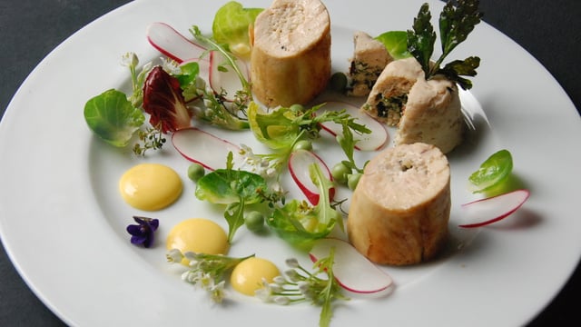 Roulé de poulet farci d'une mousseline de volaille, citron confit, truffes, citronnelle et mousseline de volaille farcie de girolles et herbes, sabayon de citron et légumes