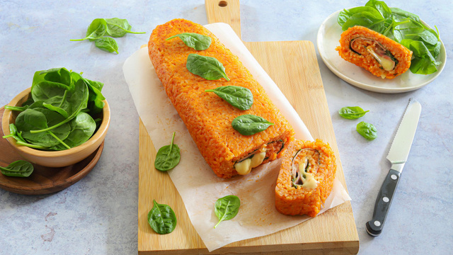 Voilà un roulé farci, gourmand et original que l’on prépare avec du risotto ! C’est aussi une bonne idée anti-gaspi, pour accommoder un reste de risotto. On farci ce roulé avec des pousses d'épinards, du jambon et du fromage saint-nectaire. Il est facile et rapide à préparer et vous pouvez le proposer comme entrée ou comme plat, accompagné d'une belle salade verte.