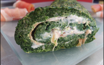 Roulez le roulé du côté de la largeur et serrez-le avec du film plastique. Placez-le au frais 1 heure ou plus. Nous l'avons dégusté froid mais encore un tout petit peu tiède, le fromage était encore un peu "coulant" !