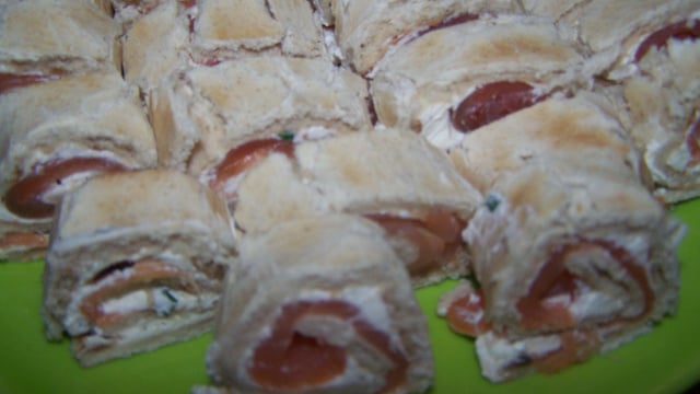 Mélanger le fromage frais et le yaourt, ajouter le reste d'aneth ciselée et le poivre blanc. Étaler ce mélange sur les galettes de pain polaire. Ajouter les tranches de saumon fumé et rouler serré.