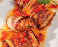 - Après les avoir épépinés, couper les piments en petits cubes et en parsemer sur les rouleaux d'aubergines.