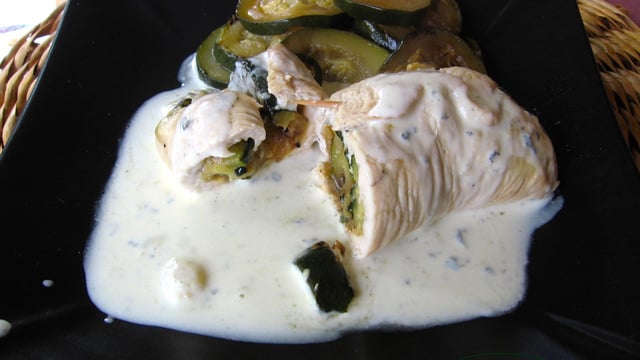 Servir avec les courgettes restantes et arroser de crème à la fourme.